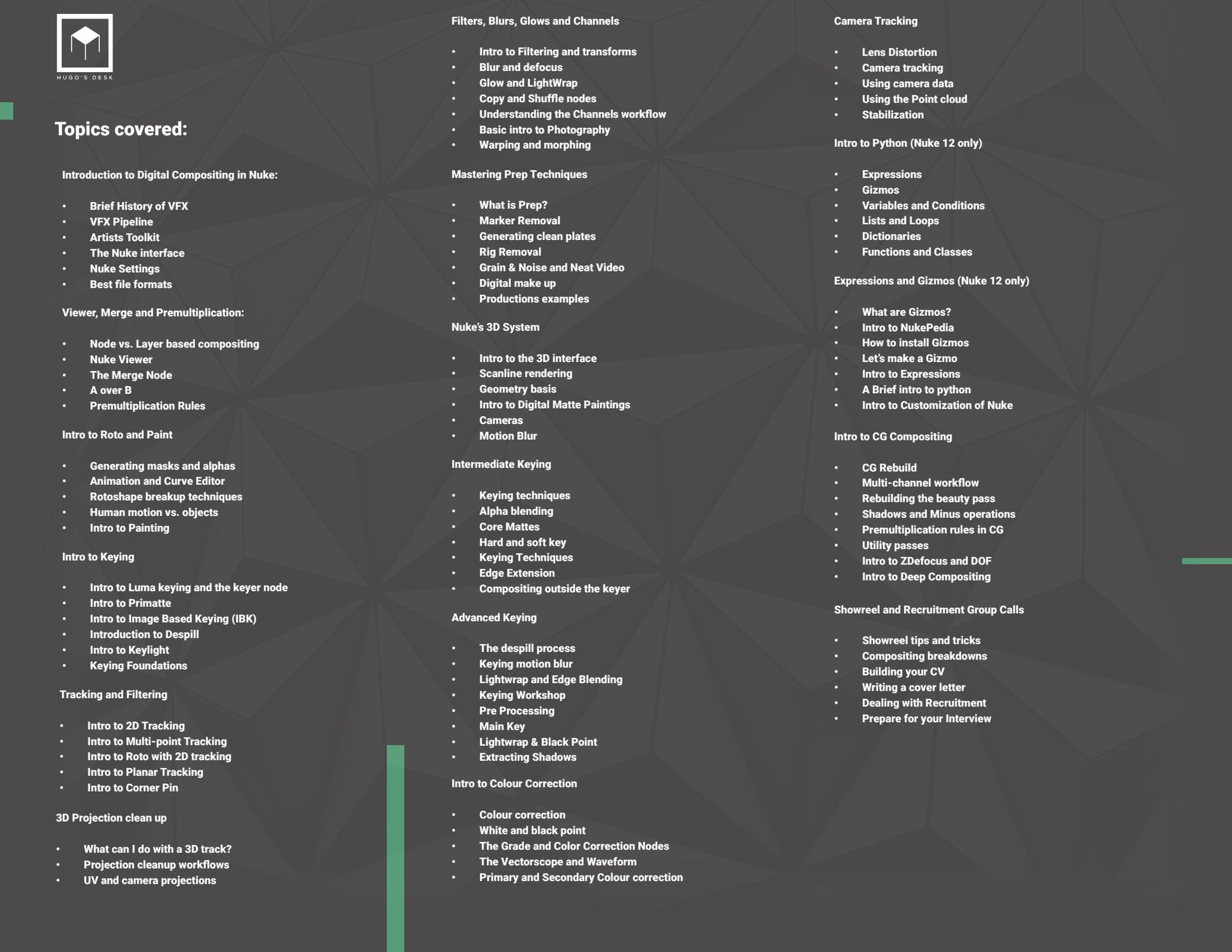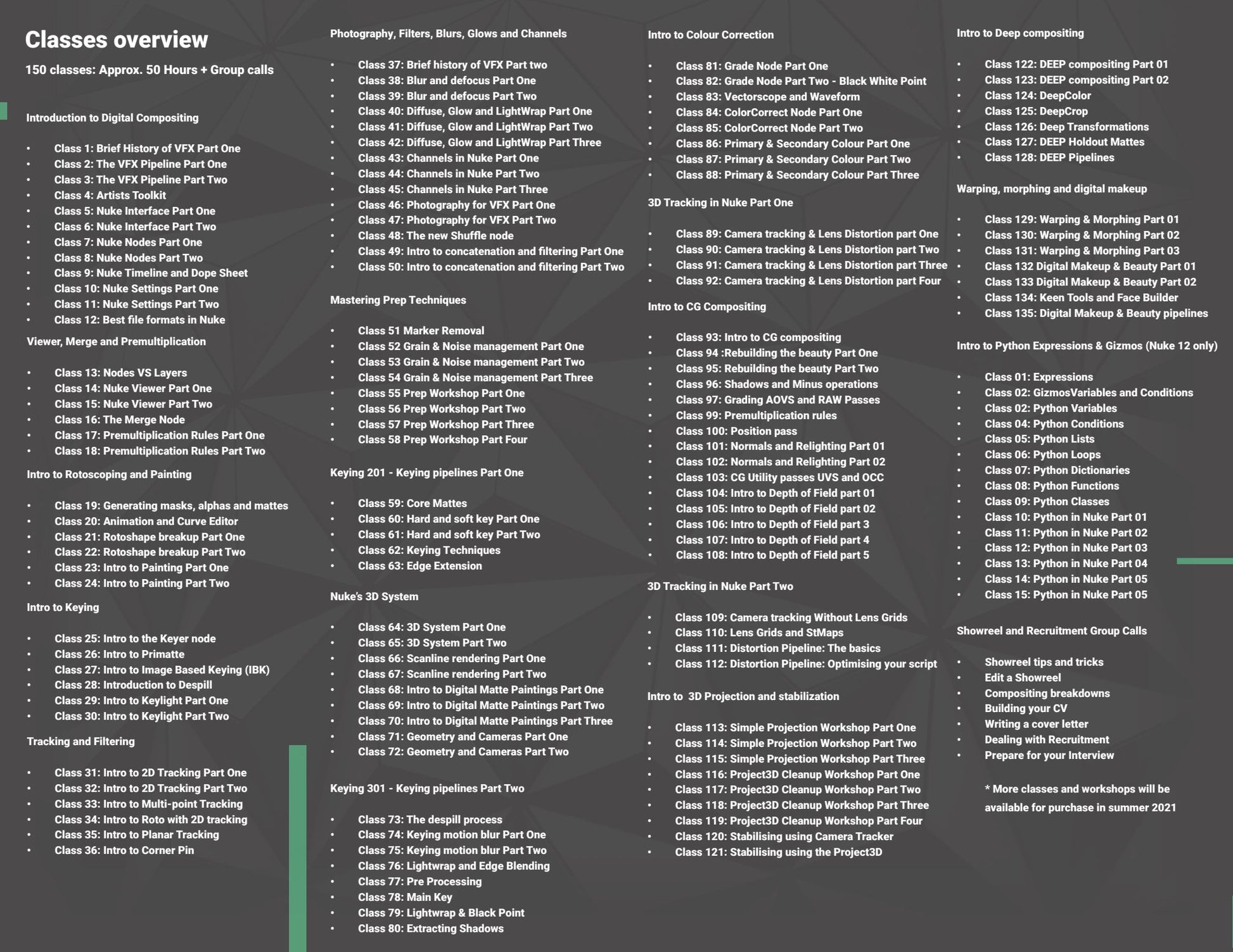 You will learn industry-level rotoscoping, prep, clean up, painting, keying, composition, lighting, photography basics, the history of VFX, colour correction, CG compositing, 3D projection, camera tracking, Python scripting, and so much more. This course was created by compositors for compositors. A full curriculum can be found in the images above.
